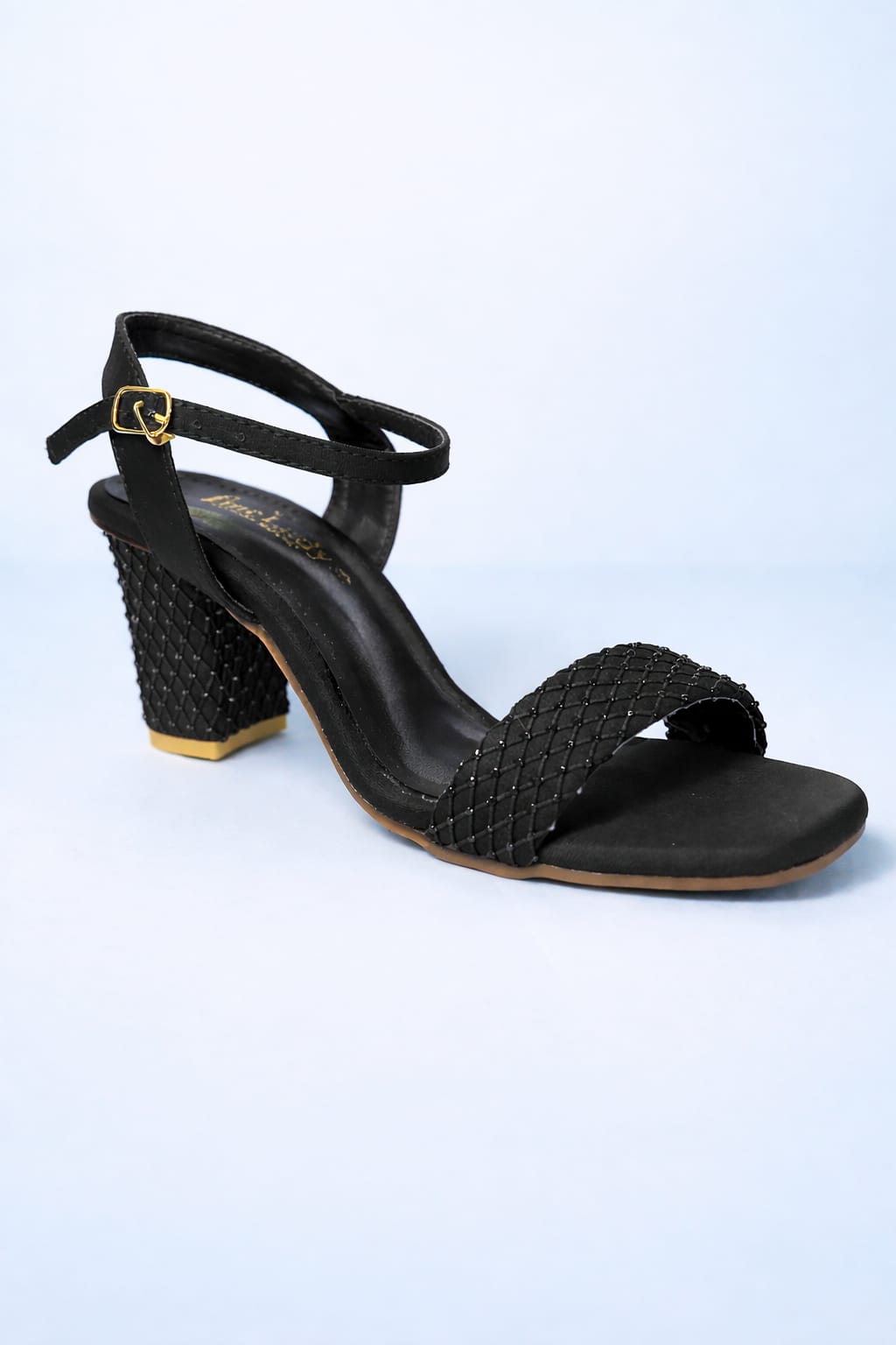 Make a bold and classy statement with these women’s black embellished block heel sandals. Designed with a stylish textured front strap and detailed beaded block heel, this pair adds instant elegance to any outfit.
